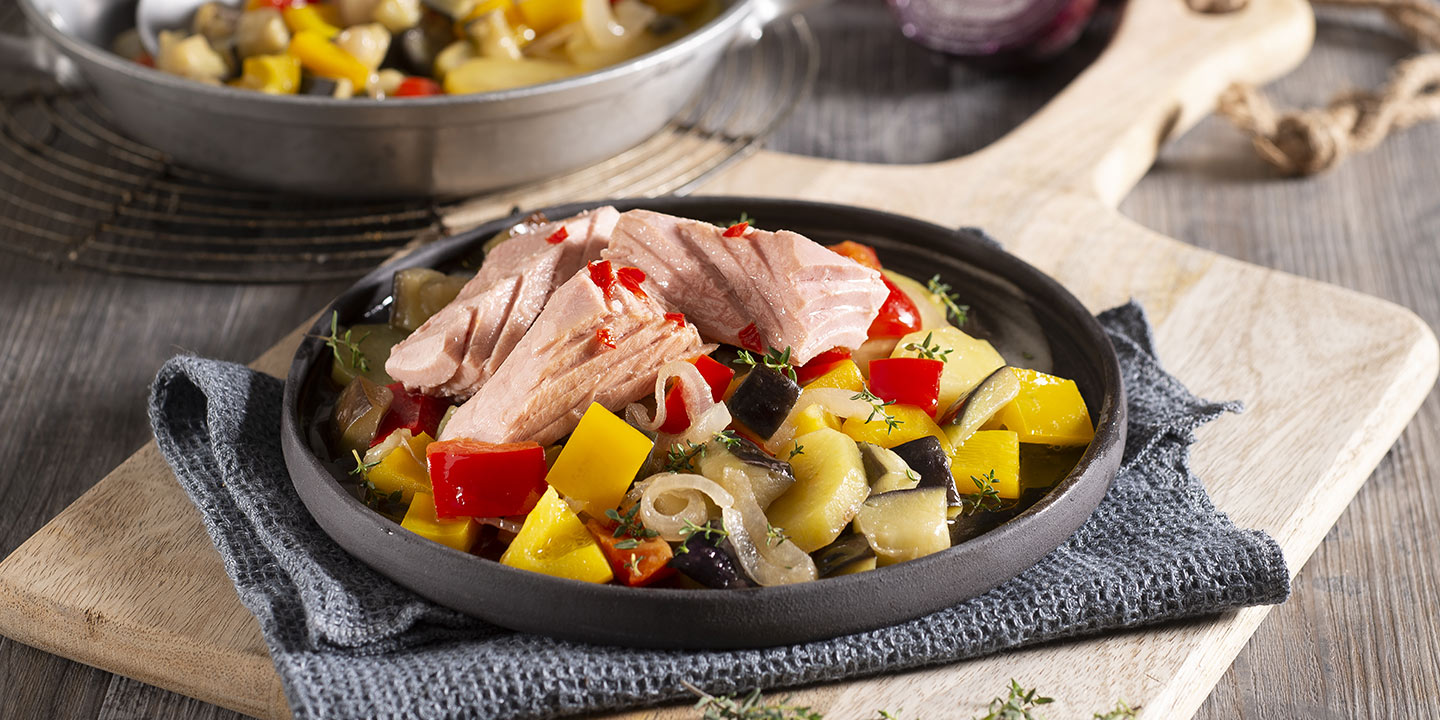 3. Sistemate nei piatti le verdure cotte tiepide o a temperatura ambiente, adagiate sopra i filetti di tonno con il loro condimento, completate i piatti con un poco di timo e gustate subito.