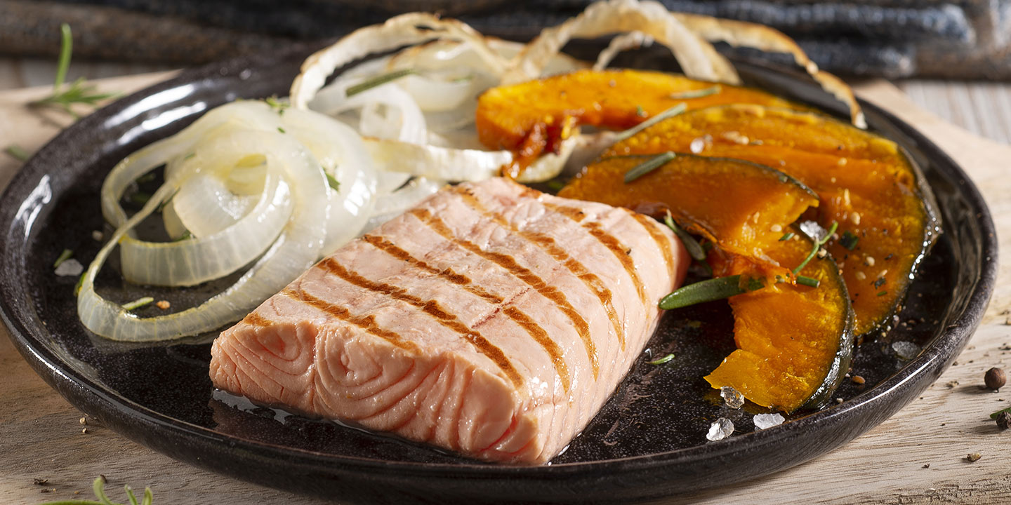 Filetto di salmone grigliato con zucca e cipolle al forno