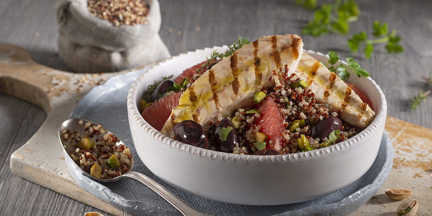 3. Radunate la quinoa, le olive, i pistacchi, il prezzemolo, le scorze di limone, il timo privato della parte legnosa e il pompelmo, girate con delicatezza, adagiate sopra i filetti di sgombro grigliati e portate in tavola.