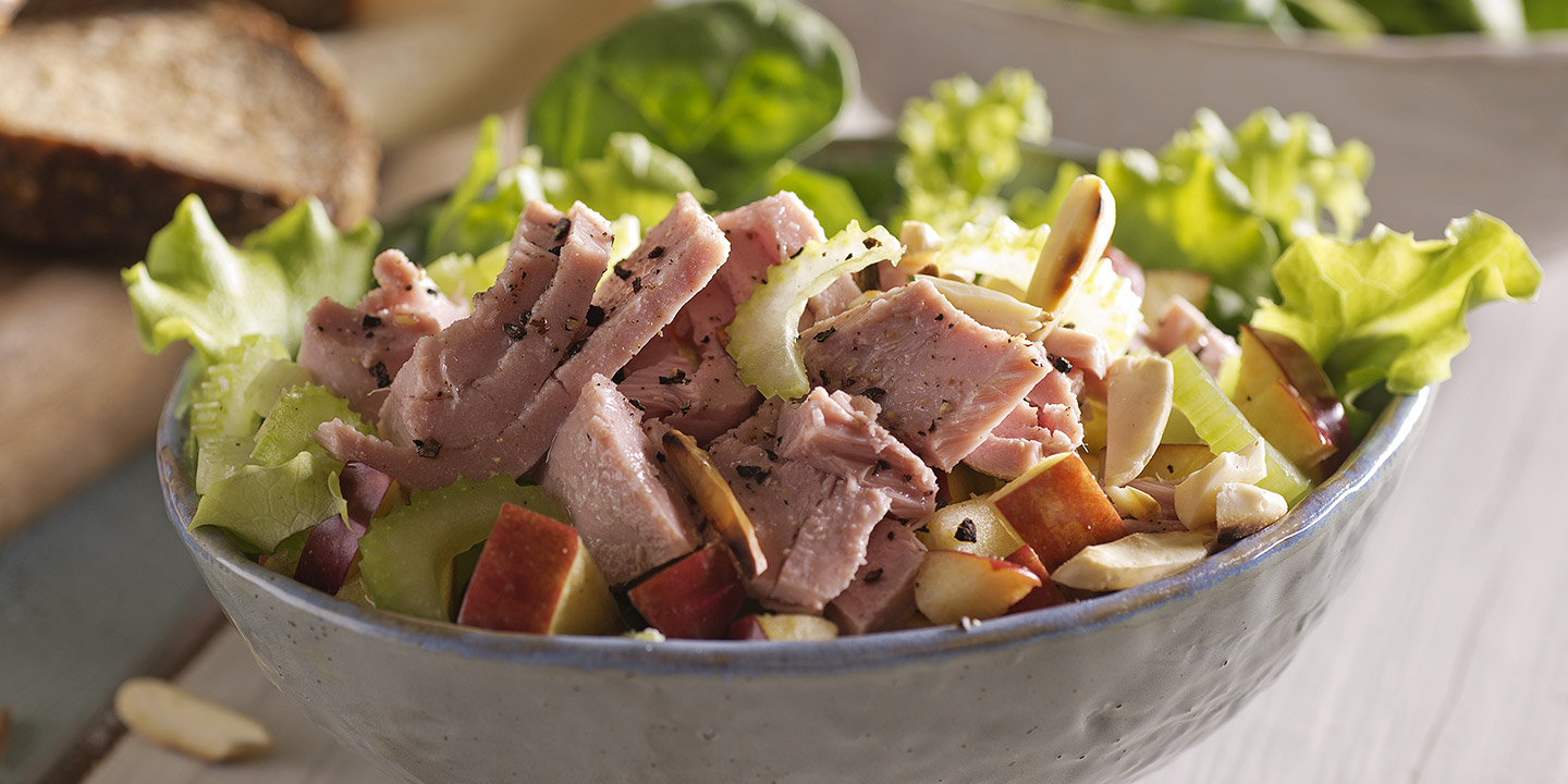 4. Adagiate l’insalata in un piatto, disponete sopra il tonno con la mele e completate con le mandorle tostate.