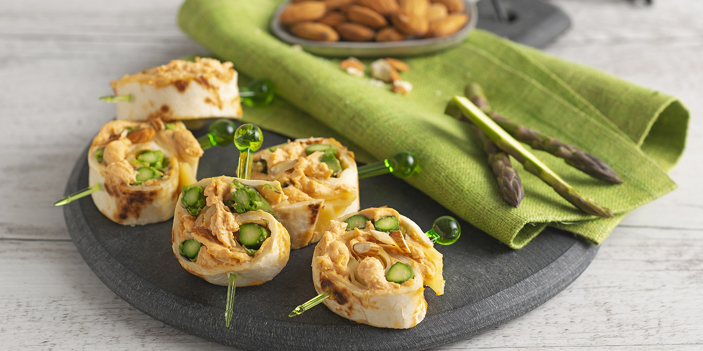 1. Sminuzzate grossolanamente le mandorle; adagiate sopra alle piadine l’emmenthal affettato, poi sistemate gli asparagi quindi spremete sopra a tutto il Paté Rio Mare Salmone Rosa.