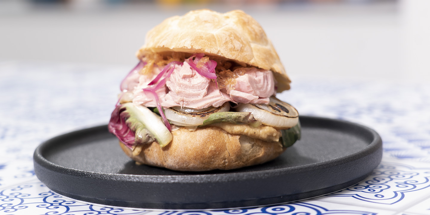 4. Adagiare la crema di ceci sulla base del panino poi aggiungere le cipolle alla griglia;