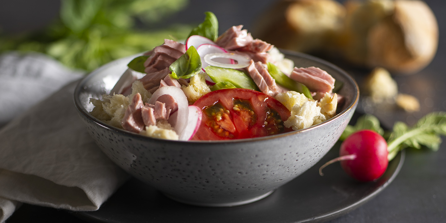 3. Scolate il tonno, spezzettatelo e unitelo al resto degli ingredienti. Mescolate bene, versate la panzanella nei singoli piatti e decorate con qualche foglia di basilico.