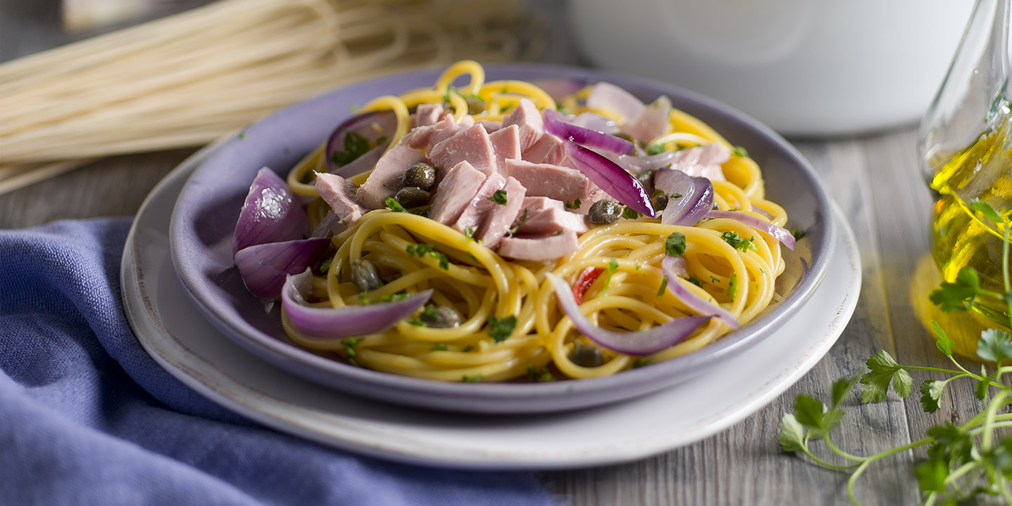 3. Fate rosolare in una grande padella l’aglio e la cipolla con l’olio e il peperoncino, aggiungete i capperi e il tonno non eccessivamente sgocciolato.
