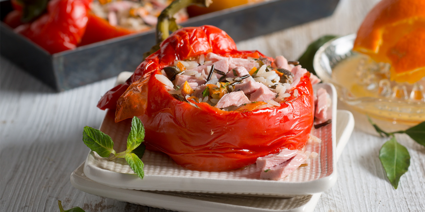 3. Scolate il riso e lasciatelo raffreddare, unite il riso al trito precedentemente preparato, quindi riempite i peperoni ben sgocciolati.
