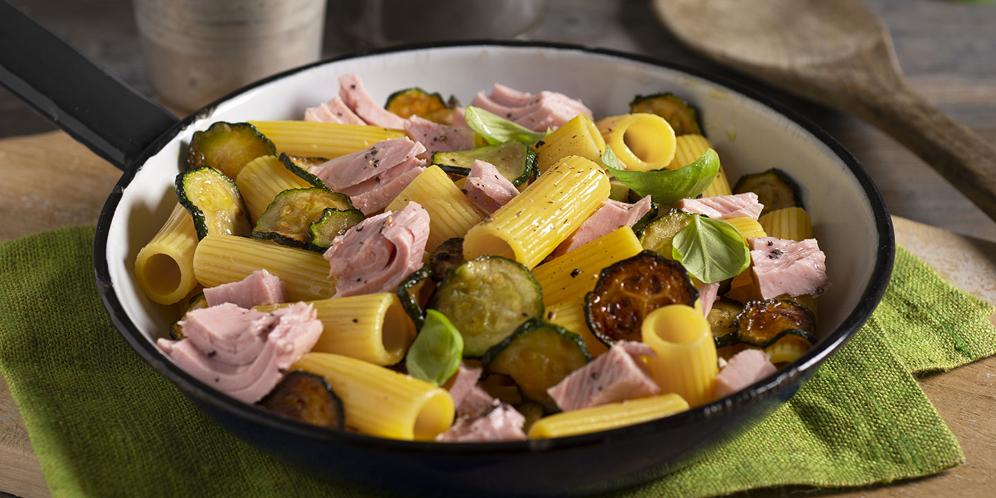 4. Aggiungete il tonno alle zucchine, completate con la pasta scolata e saltate in padella in modo che il tutto si insaporisca bene; completate con il basilico fresco e gustate immediatamente.