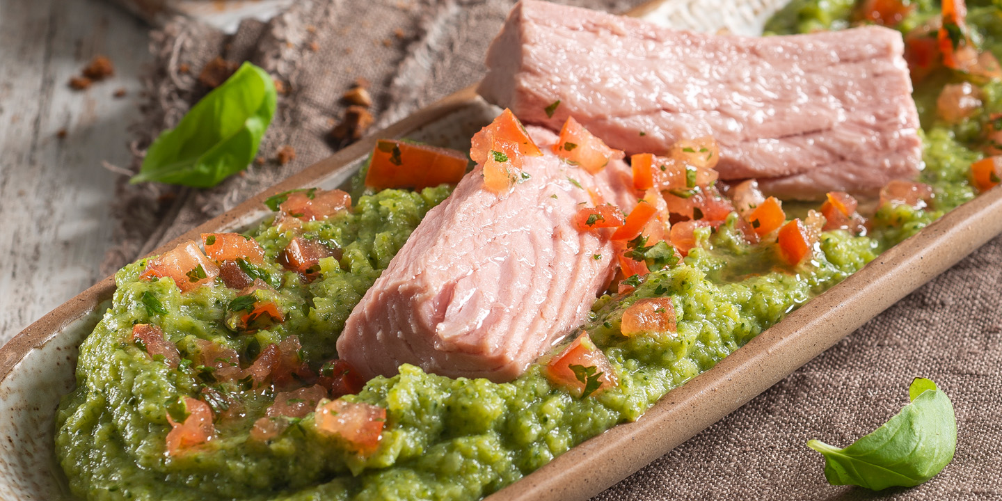 4. Sistemate in quattro piatti la salsa di broccoli, adagiatevi sopra i filetti di tonno sgocciolati divisi in parti uguali e completate con il pomodoro e il suo condimento.