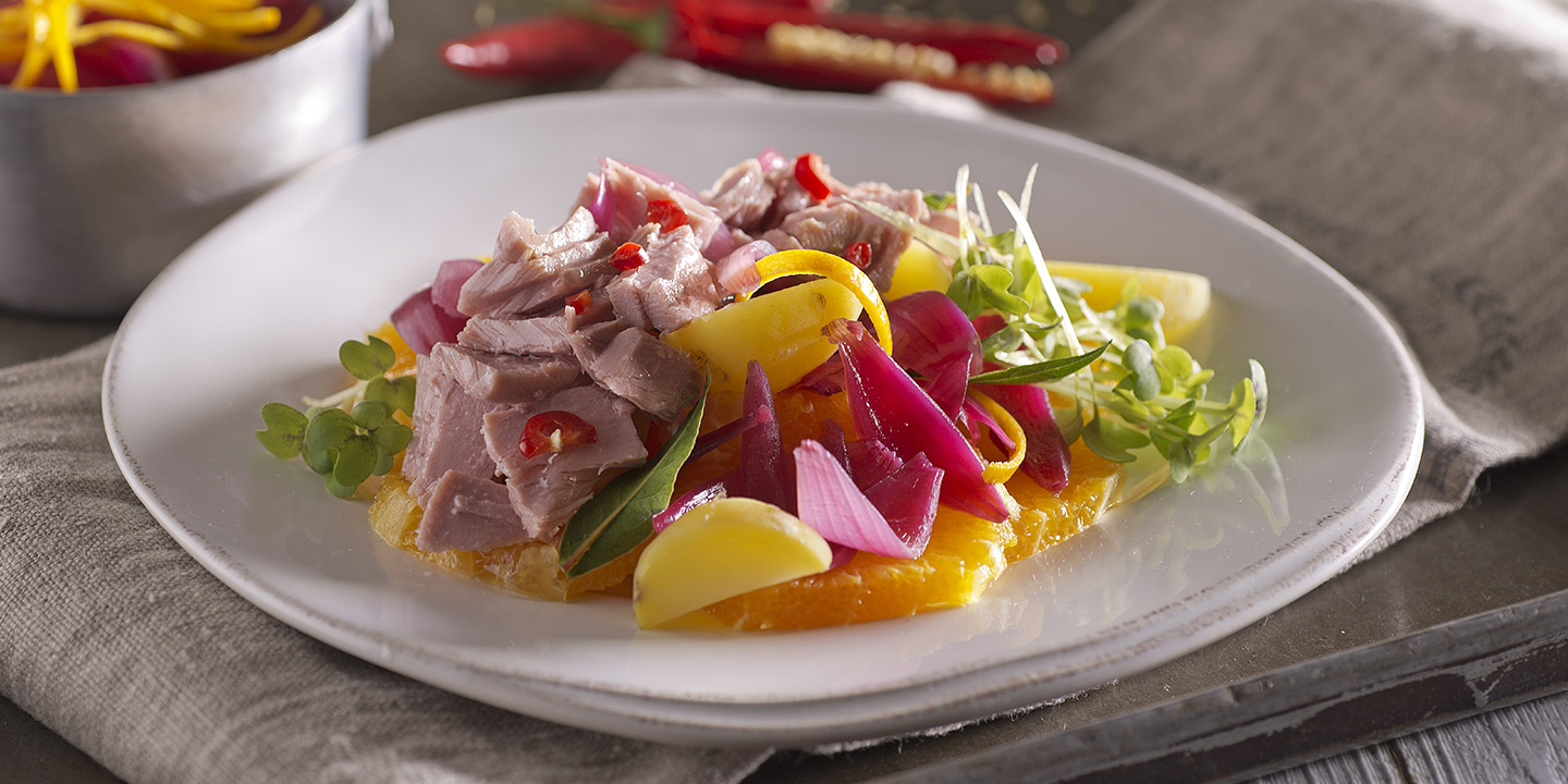 Tonno al peperoncino con cipolle rosse spadellate e arance