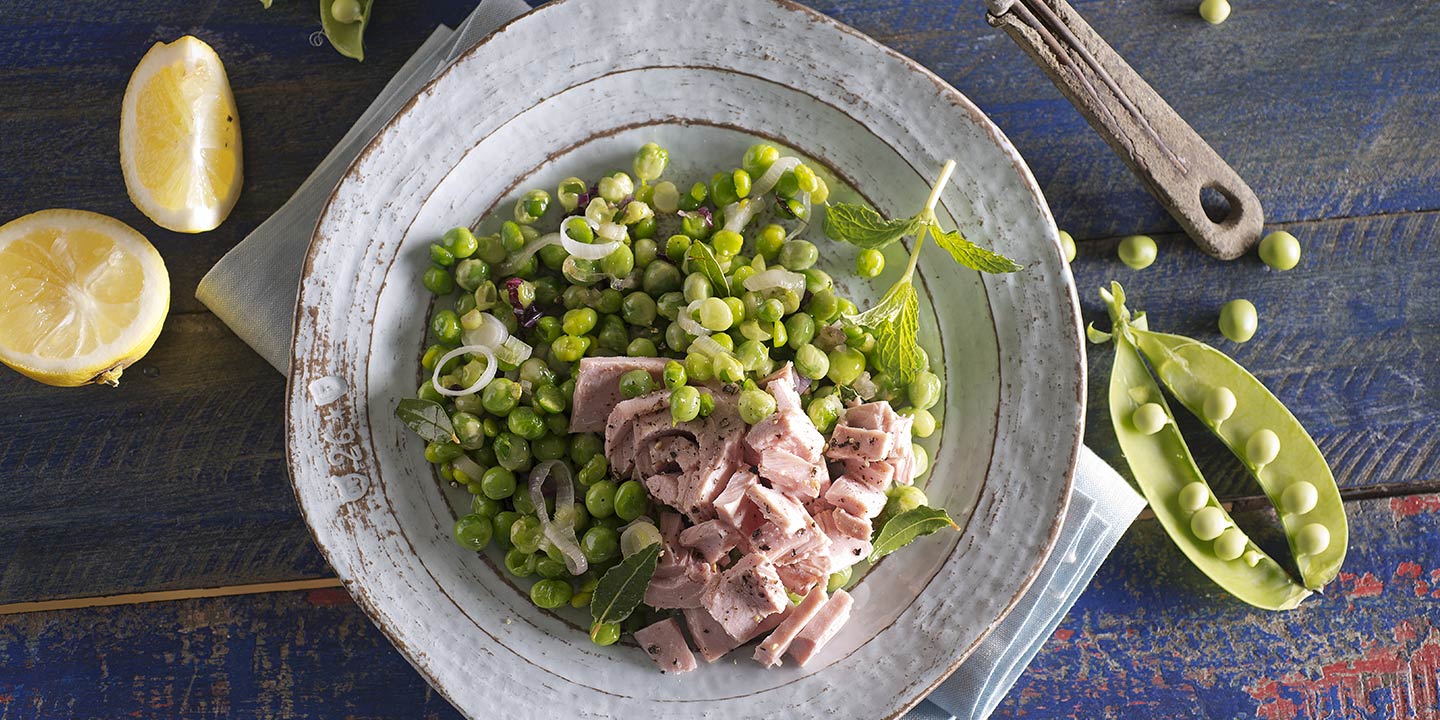 HomeRecipesTonno con piselli freschi, cipollotti e alloro