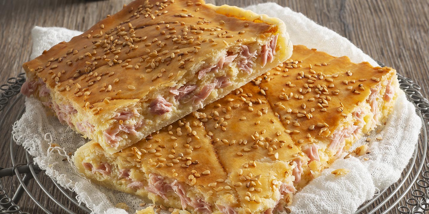 4. Foderate il fondo e i fianchi di una teglia con quella più grande, versate il composto frullato di formaggi e tonno, chiudete con la pasta rimasta.