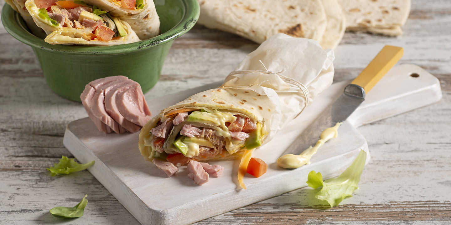 4. Insaporite con qualche goccia di succo di limone, un poco di sale e abbondante pepe, arrotolate i wrap avendo cura di non far uscire la farcitura, scaldateli velocemente nella padella utilizzata in precedenza, tagliateli a metà in diagonale e gustateli subito.